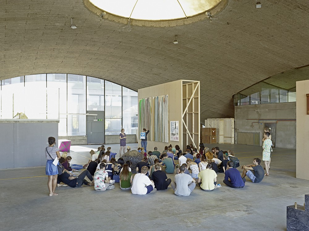 Created with the architect Constantin Hilberer, the Sicli Pavilion is the crowning achievement of the Swiss engineer Heinz Isler and was commissioned by Frédéric Sachs, owner and director of the Sicli fire extinguisher factory. Completed in 1969, the virtuosity of this building and its specific character derive from the use of two asymmetrical shells, thin veils of reinforced concrete that, although immobile, look as if they are about to take flight. This “architecturesculpture” seems to come straight out of science-fiction. Today, this double flying saucer is a heritage jewel used to host cultural events. Ironically or by happy coincidence, Smoking Up Ambition! is being displayed in a space previously used for the manufacture of fire extinguishers. Perhaps there really is no smoke without fire or ambition without illusion? Or shall we all be smoked out? The exhibition takes over all the rentable spaces, covering around 1000 m2. Multiple perspectives are provided by the huge hall with the large dome, whose vault and oculus are reminiscent of the Pantheon in Rome. It is also possible to view the works exhibited in the large dome from the upper floor with a bird’s eye view that, far from being divine, takes us back to the objectivity of what is presented. No standardizing neon lighting here: glass and its transparency function on all sides. The light evolves as the hours pass. The whale contains everything, bulimic and empty.